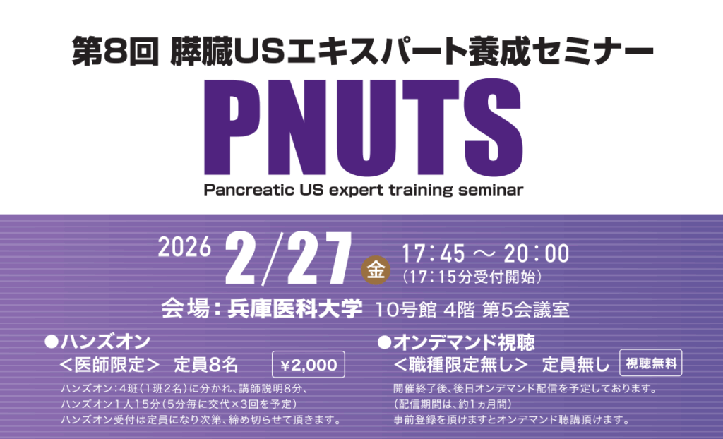 チラシダウンロード 事前登録開始日:12/1(月)18:00~ 日程:2026年2月27日(金)17:45~20:00 【会場参加】 ■ハンズオン(医師限定):8名≪参加費:2,000円≫ *ハンズオン:4班(1班2名)に分かれ、講師の説明8分 *ハンズオン1人15分(5分毎に交代×3回を予定) *ハンズオン受付は定員になり次第、締め切らさせて頂きます。 場所:兵庫医科大学 10号館4階 第5 […]